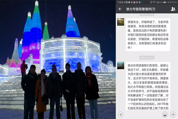 2017年的年中,黑龙江省铁力市人民医院史家明院长加我微信,告诉笔者他要派五名医院中高层管理人员参加我们医院管理师第五期高级研修班的学习。报名后我们俩还建了一个微信学习小组群,史院长和笔者做了教学分工,我俩一个做线上教学一个做线下辅导。参加的五名学员中,有一名副院长、医务科长、护理部主任,还有一名临床科主任和一名药剂科负责人。也为了总结和完善线下小组的学习模式,年前专程从武汉去了铁力市人民医院,与史院长共同主持了医院管理师高级研修班的一次线下小组课堂。