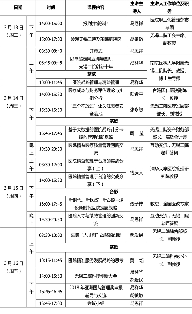 南京医科大学附属无锡第二医院在不断获得国际医院管理大奖后,2018年初又第三次荣获“中华医学科技奖:卫生管理奖”,无锡二院的创新管理已经成为引领中国大陆地市级医院和县域医院的一个标杆和典型样本。受到国内和国际同行的高度关注。其创新性、实战性、可复制性与国际化管理模式有许多的亮点,值得中国医院院长们深度研究和学习思考。特别是无锡二院首创的医院精益管理链获得了2015年度世界性国际医院管理大奖——IHF国际杰出大奖。这也是由115个国际会员组织的IHF大奖设立以来,唯一一家中国医院获奖的项目。为此,亚洲医院管理大会也将在2018年到中国无锡召开亚洲医院精细化管理的现场研讨和交流大会。本次为推动中国地市级三级医院和县市级创三级医院以及区域医疗中心的建设与管理,加快现代医院制度的建立,强化公立医院内部运营,提升医院管理水平,使公立医院在医疗改革进程中做到更精、更细、更强,中国医院职业化管理网、医院职业化管理(香港)杂志社将在无锡举办一期“医院精细化管理暨国际化战略院长高级研修班”,本班的深度研讨得到了国内知名医院管理专家、中国获得国际和亚洲医院管理奖最多的院长——南京医科大学附属无锡二院易利华教授的鼎力支持,将亲自授课和解疑答惑。清华大学医院管理研究院钱庆文教授(台湾精益医院管理著名专家)、全国医改专家魏子柠教授、台湾国仁医院副院长陆希平教授及无锡二院管理团队的实战老师,重点介绍医院“人才树”发展战略、医院“五个不放过”的医疗严管制度、医疗成本与财务评估理论与实例分析、医院战略计分卡的绩效管理创新系统等前沿医院管理课程。同时,还将设置今年亚洲医院管理奖申报的辅导交流专场。现就有关事项通知如下: