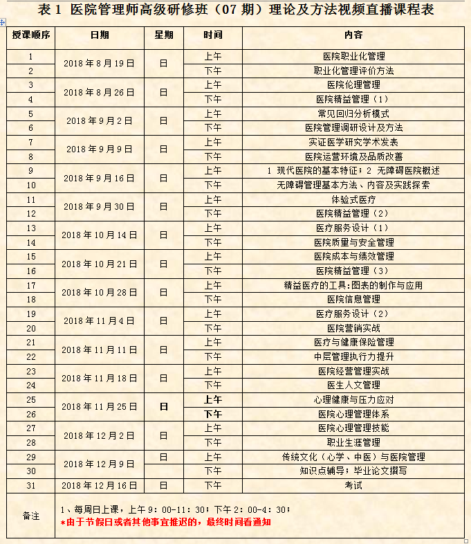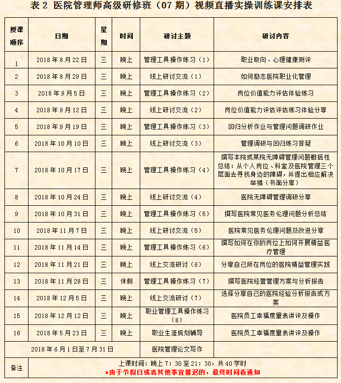 上课时间为4个月(每周日上午+下午各2个半小时的理论课学习,每周三晚1个半小时的在线案例研讨,每期课程结束后完成作业。),论文辅导及答辩2个月,培训完毕即可参加考试。统一在线考试,具体考试时间、方式另行通知。