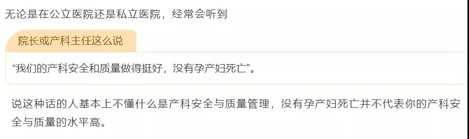 第二篇《院长日记之没有孕产妇死亡就是产科质量好吗?》,文章分析的整体角度也是笔者认可的。产科的整体质量当然是综合的,但在事关产妇母婴安全的管理上,也需要有一票否决的要求,不能因为产科整体质量高,管理目标上就容许产妇死亡。医院流行的6σ管理就是追求零缺陷管理,按职业化管理要求,零缺陷管理一定属于产科的质量管理的基本追求。
