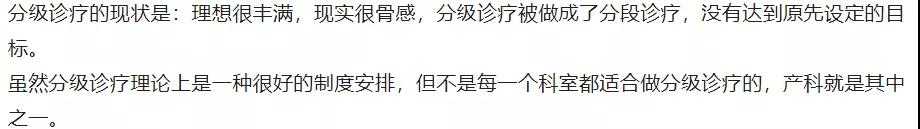 另外,文中说分级诊疗不等于分段诊疗,这恰恰是作者不理解职业化管理的系统化,互联网医疗就是把医院做到了互联网智慧医院,在互联网思维和医联体双向下,基层医院就如同城市大医院的科室或分院,基层医院的产科与城市大医院的产科就可以通过分段医疗来使医疗资源合理配置,使病人的医疗成本做到最小化。分级医疗要做责任分工与分级,拿产科来说,基层医院做生理产科,城市大医疗做病理产科,产前保健在基层,产科疑难诊断在城市大医院。同时利用妇产保健的三级网络进行产妇从产前检查到分娩的分段医疗保健正是我们国家几十年来的成功经验。产妇从怀孕的周期长,产妇不是病人,产科凭什么不能做分级诊疗,从职业化管理的角度。从著名大医院的院长文中谈出产科不能做分级诊疗这个观点,不可能是管理无知,更有可能是医院集团利益驱使,因为在目前的环境下,大医院的运营更加困难。
