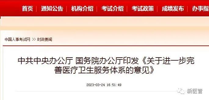 新华社北京3月23日电 近日,中共中央办公厅、国务院办公厅印发了《关于进一步完善医疗卫生服务体系的意见》(以下简称意见),并发出通知,要求各地区各部门结合实际认真贯彻落实。