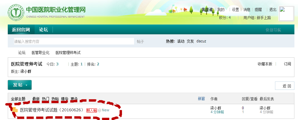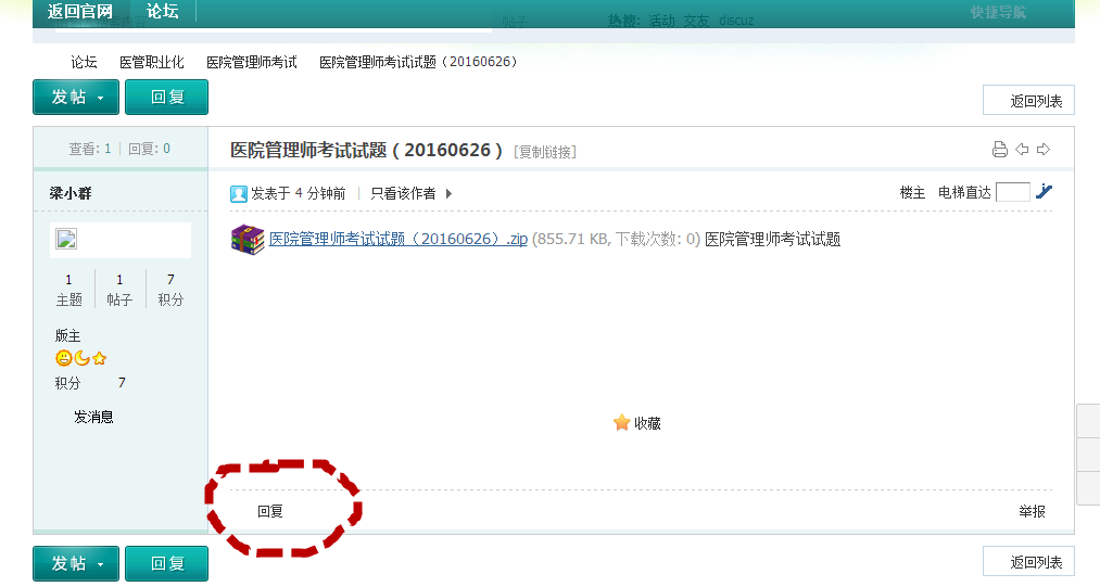 3. 打开帖子“医院管理师考试试题(20160626)”下载附件至个人电脑。