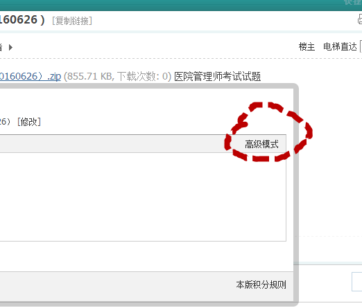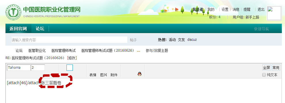 5. 提交答题卷:回复帖子“医院管理师考试试题(20160626)” →“高级模式”→“高级”→“附件”→“选择文件上传”→“ 点击附件文件名添加到帖子内容中”→正文中输入“***(考生姓名)答题卷” →“验证码”输入(注意大小写)→“参与/回复主题”。